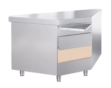 Модуль для столовых приборов. Предназначен для обеспечения потребителей столовыми приборами и подносами. Модуль имеет полку с отсеками для хранения столовых приборов. Внизу расположена открытая полка...